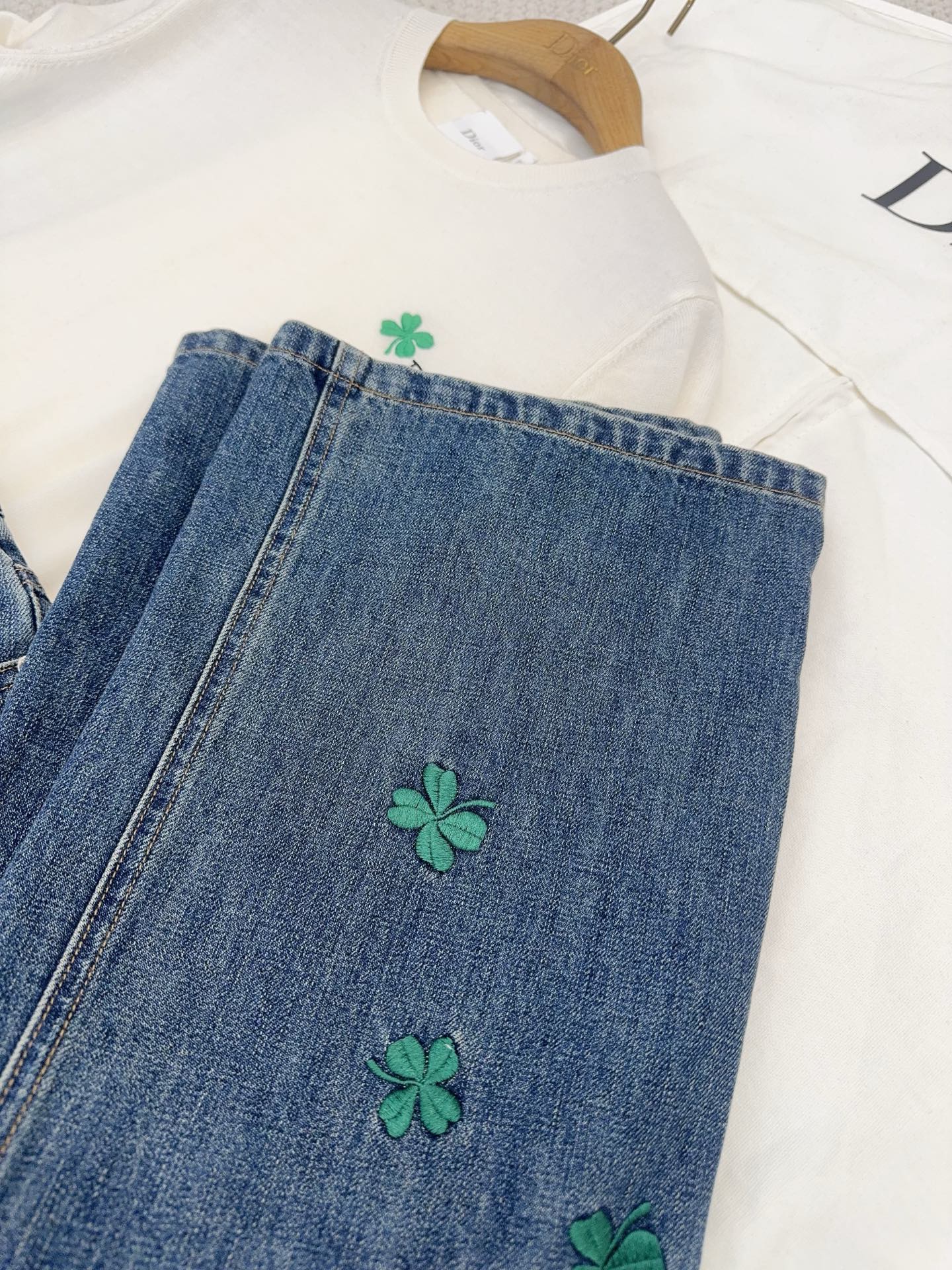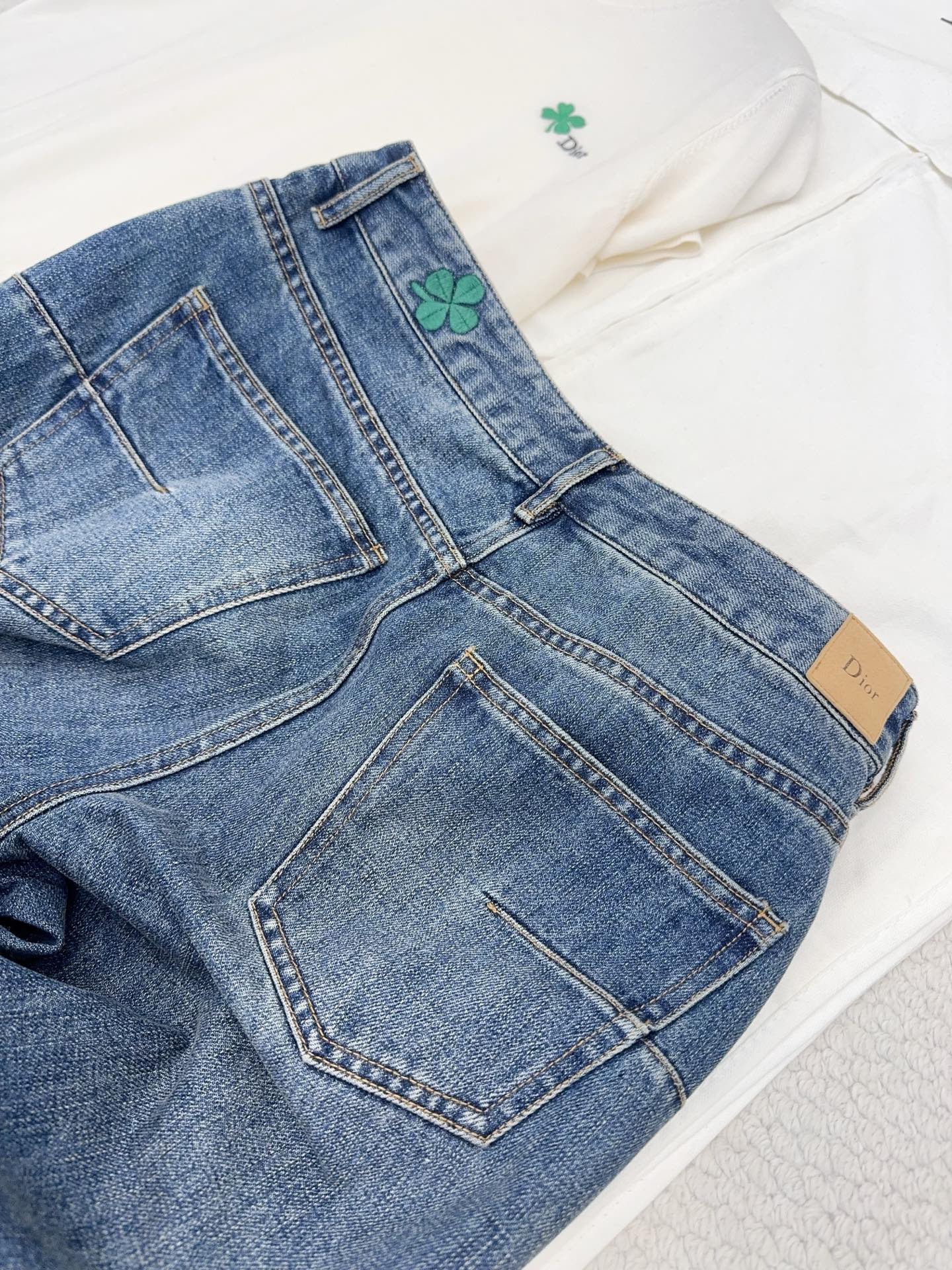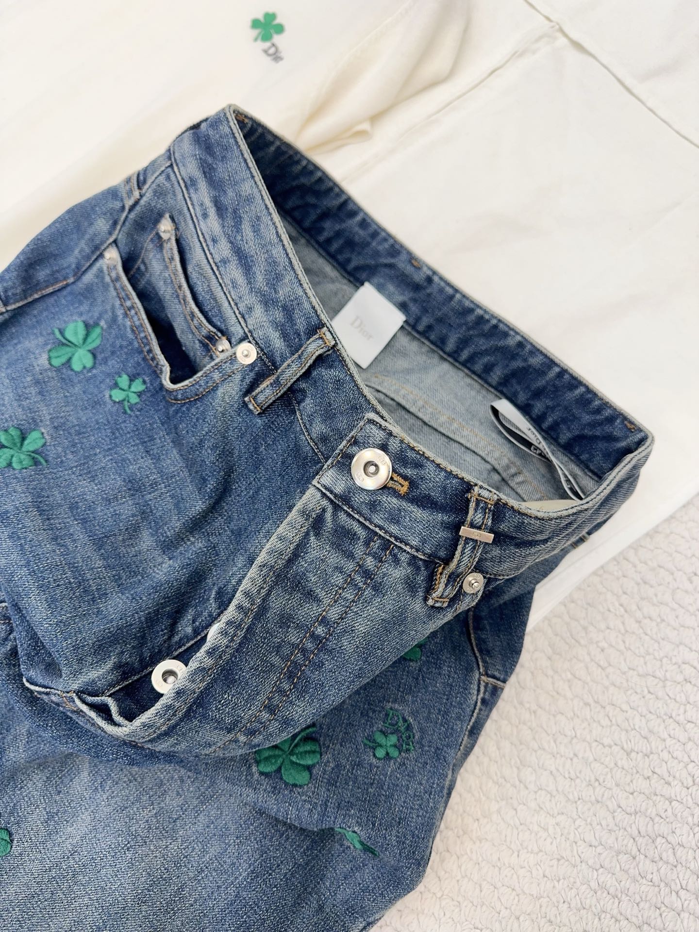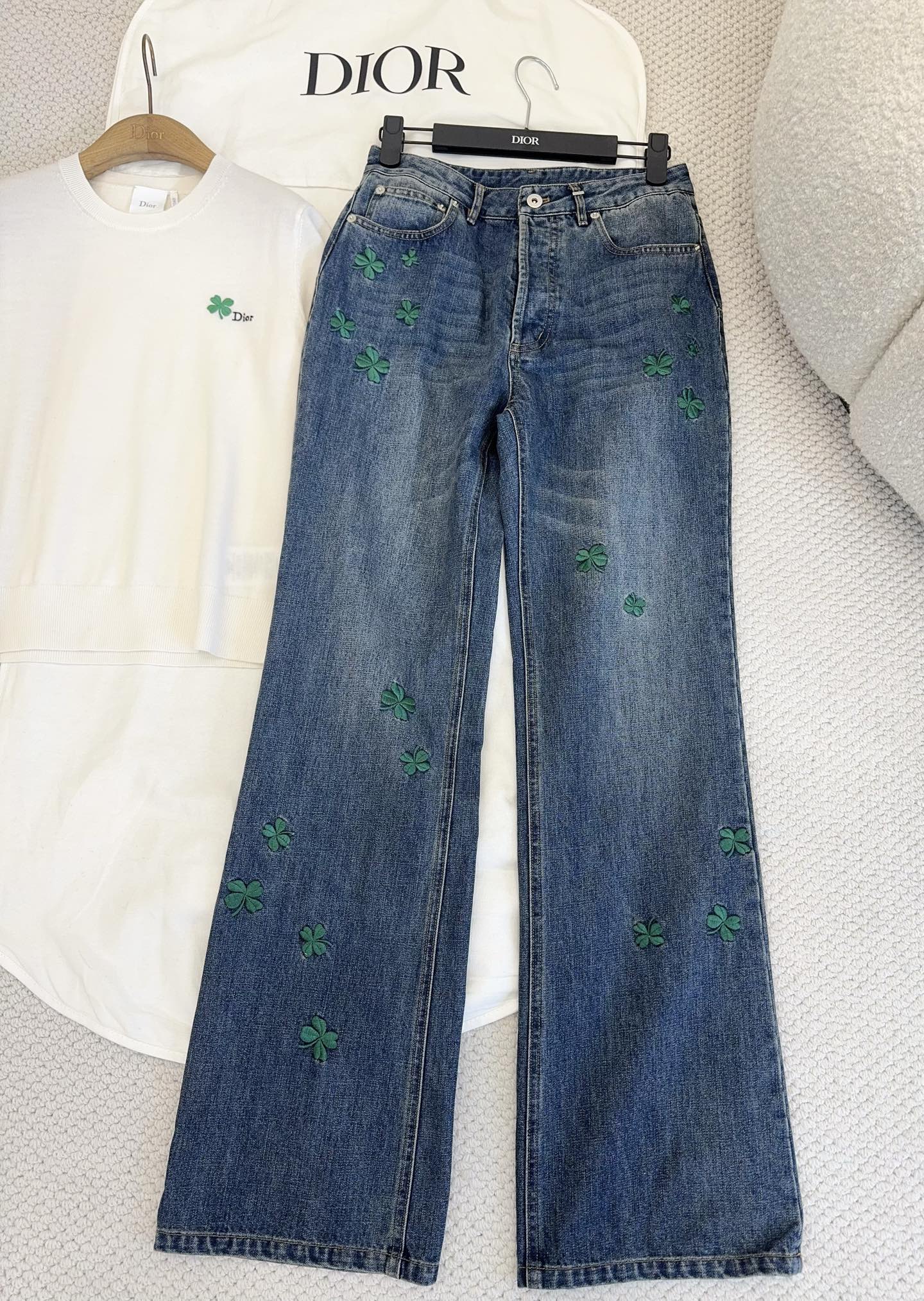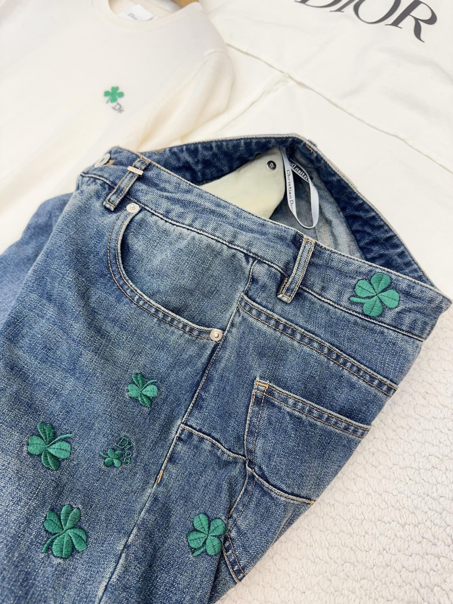 / 디올 클로버 자수 플레어 진 청바지 코튼 데님 블루 622P80X3215