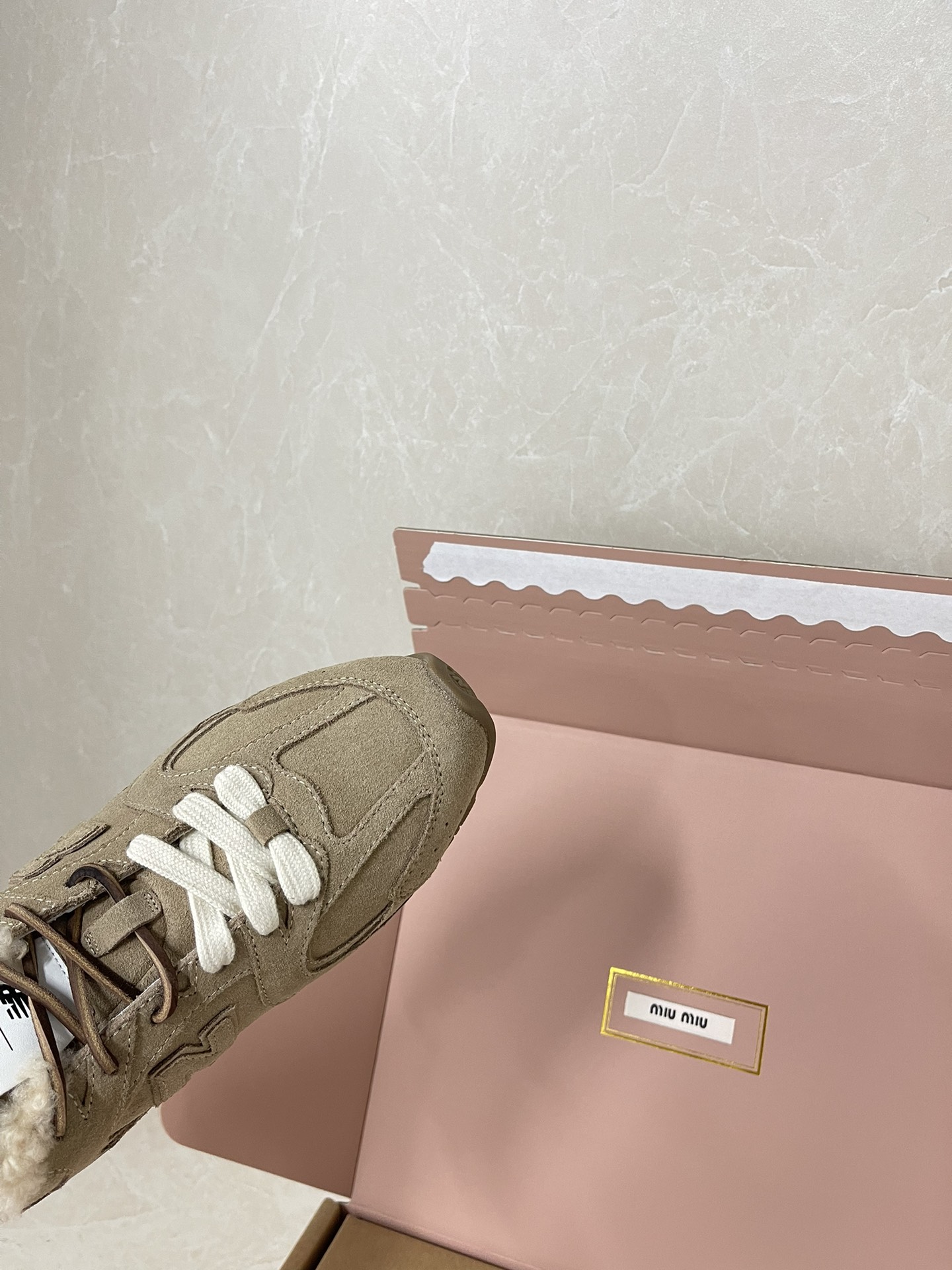 미우미우 뉴발란스 530 SL 블리치드 가죽 시어링 스니커즈 5E165E