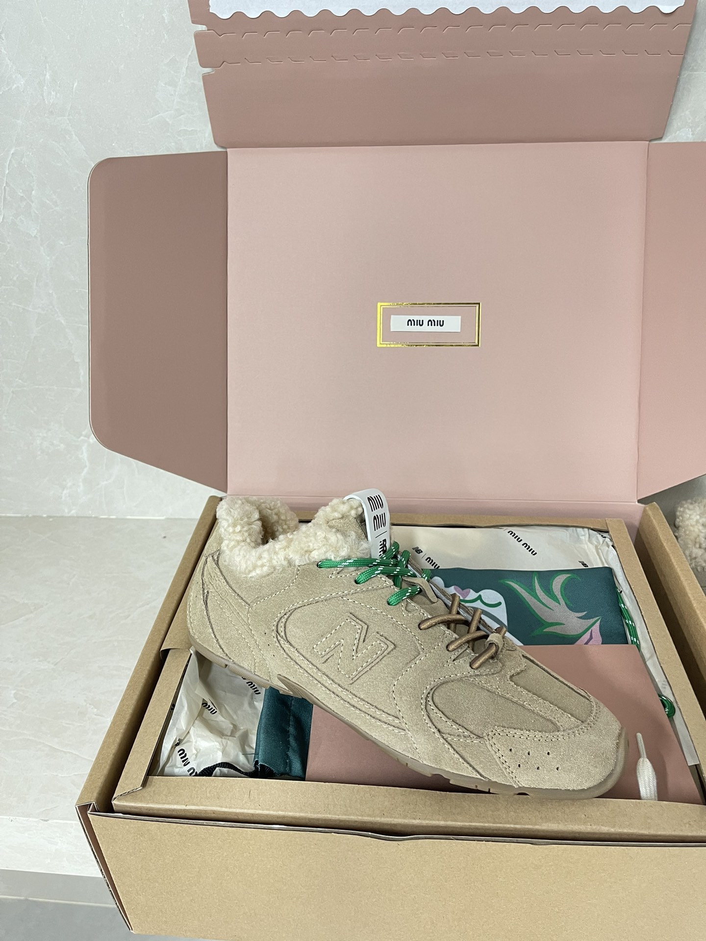 미우미우 뉴발란스 530 SL 블리치드 가죽 시어링 스니커즈 5E165E 수량