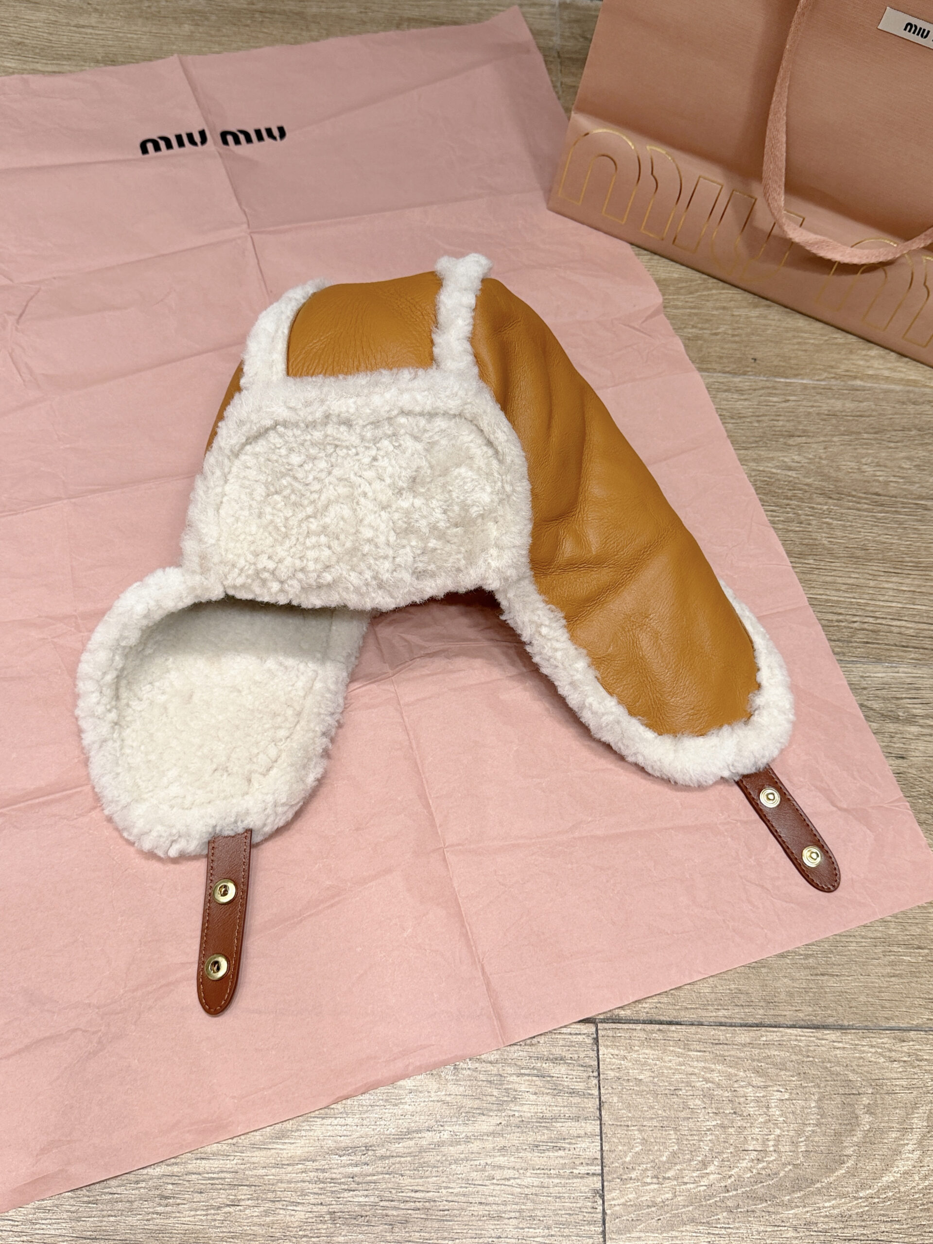 미우미우 25FW 시어링 트리밍 레더 햇 가죽 모자 수량