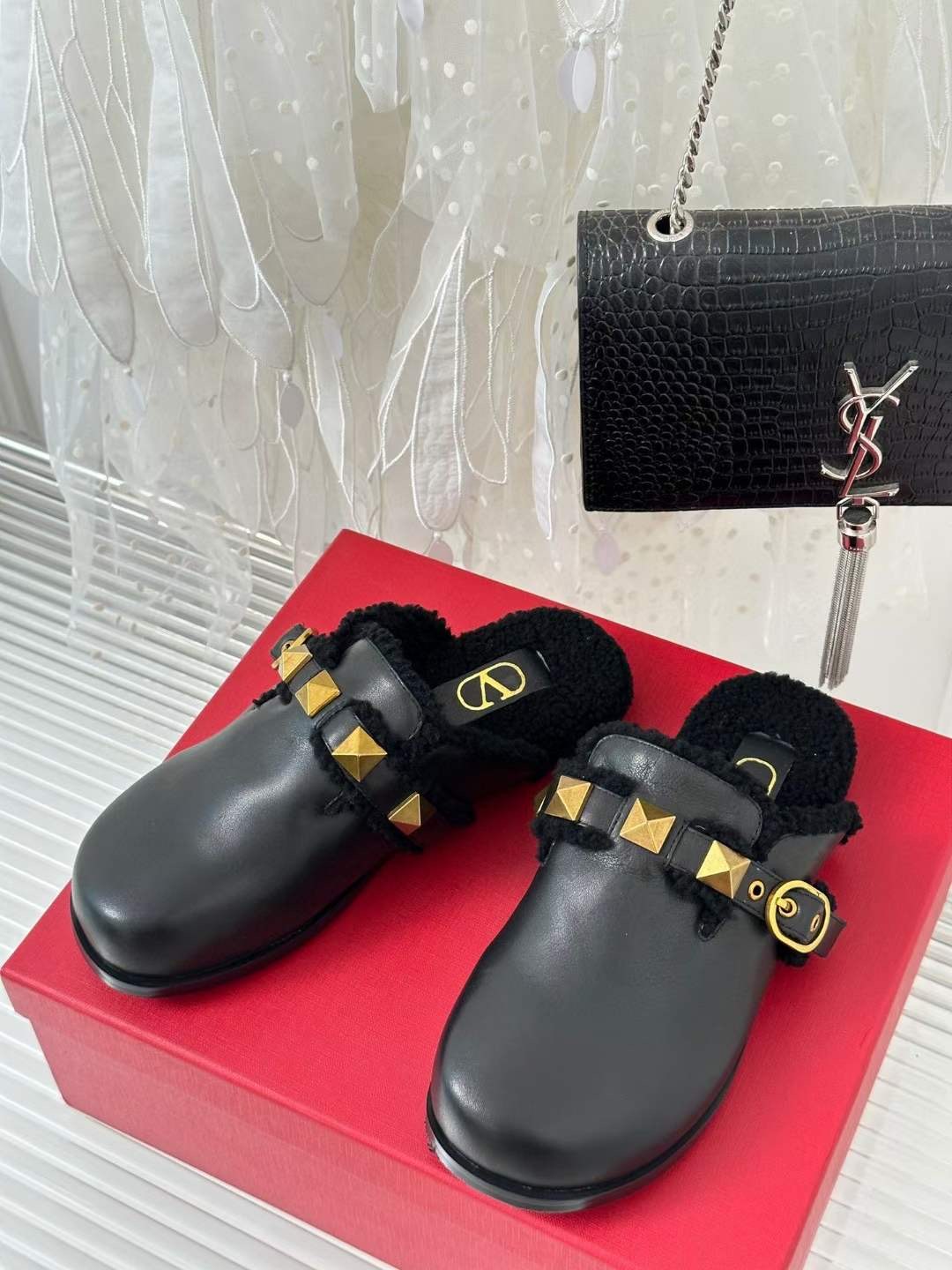 발렌티노 로만 스터드 가죽 시어링 뮬 신발