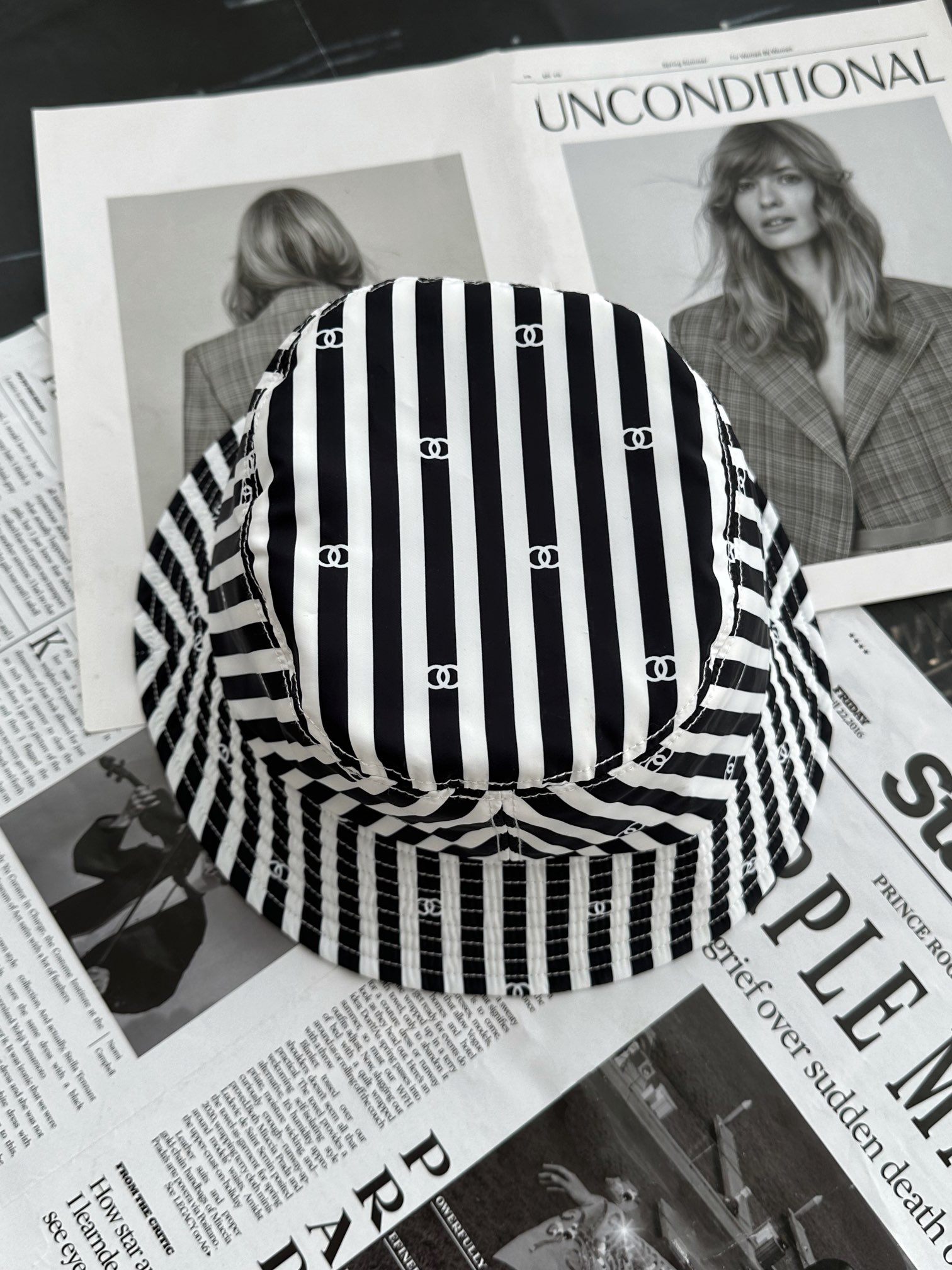 샤넬 24 코코비치 버킷햇 스트라이프 CC로고 벙거지 모자 AA9874