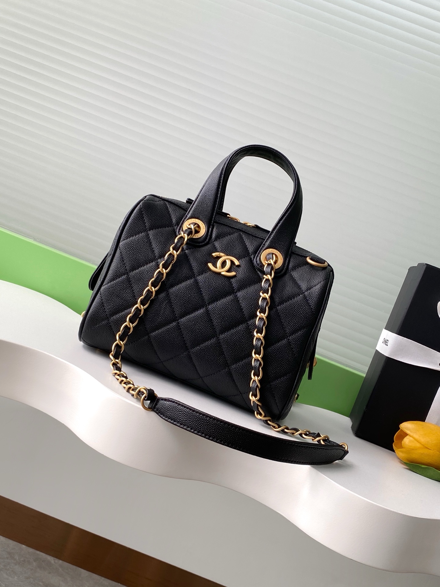 / 샤넬 25A 공방 볼링백 스몰 페이턴트 체인 미니 볼링 보스턴백 크럼블드 블랙 AS5578